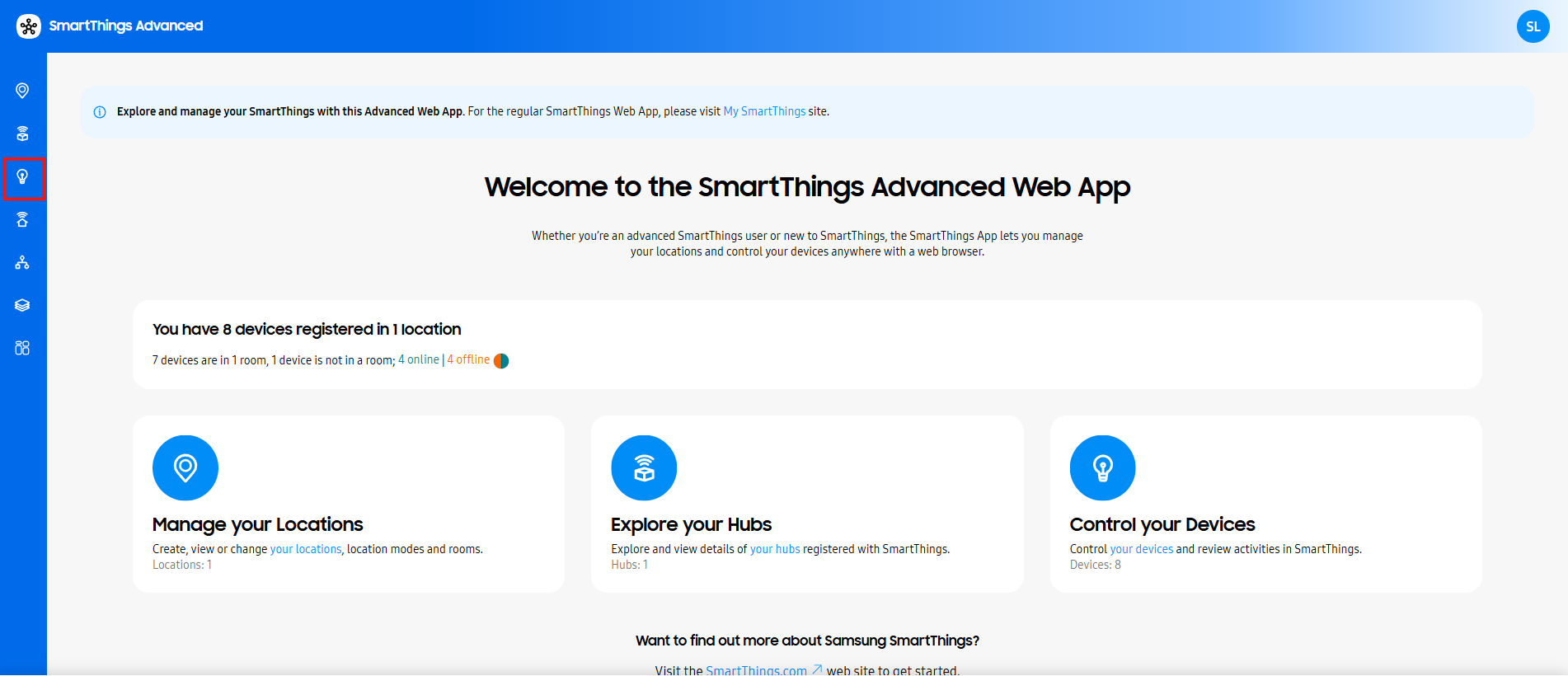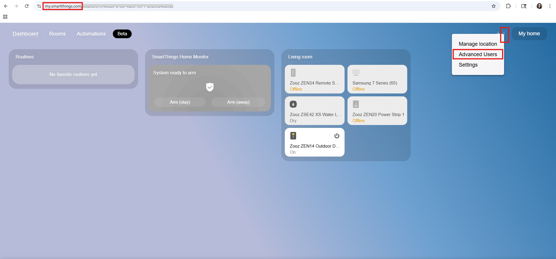 1. Access my.smartthings.com and login to your account. Click the 3 dots in the upper right corner > select Advanced Users.