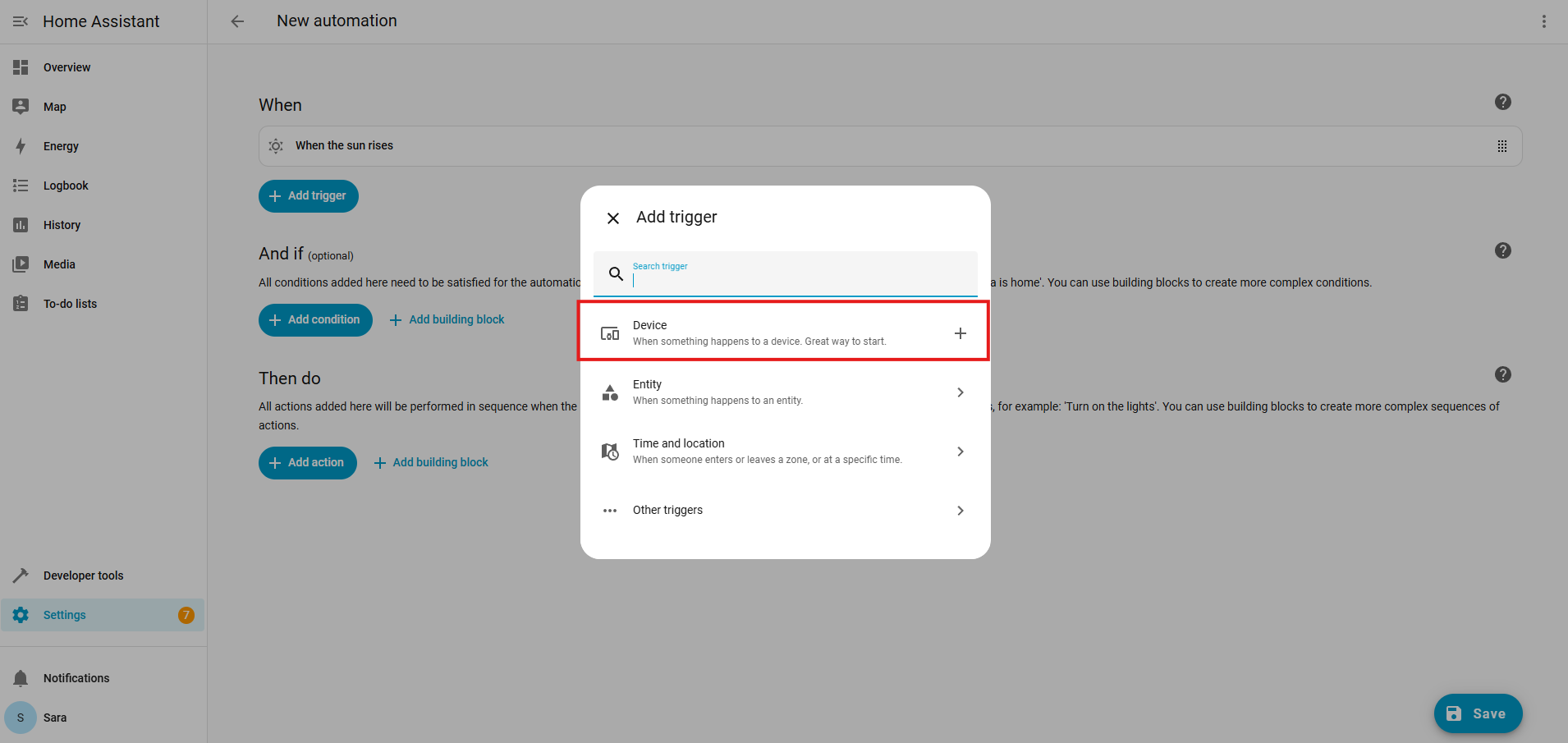 Under Add trigger > click Device.