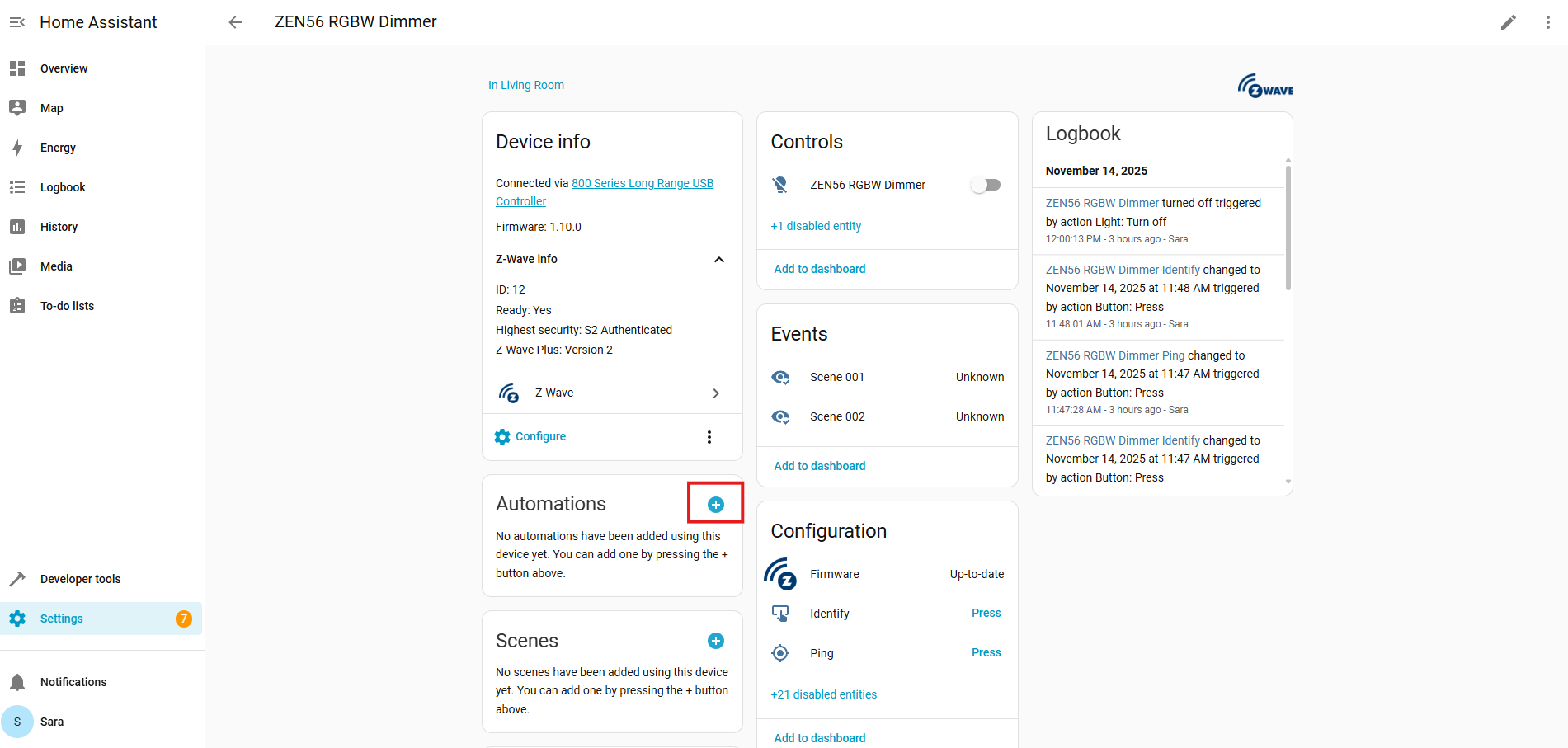 From the ZEN56 device screen, click the + on the Automations section.