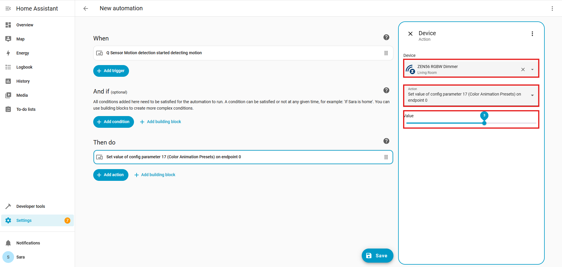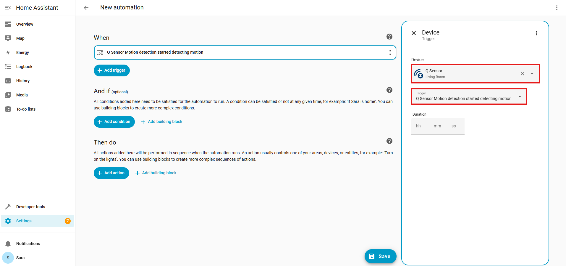 For our automation, we're using the ZSE11 Q Sensor, with the trigger set to Motion Detected.