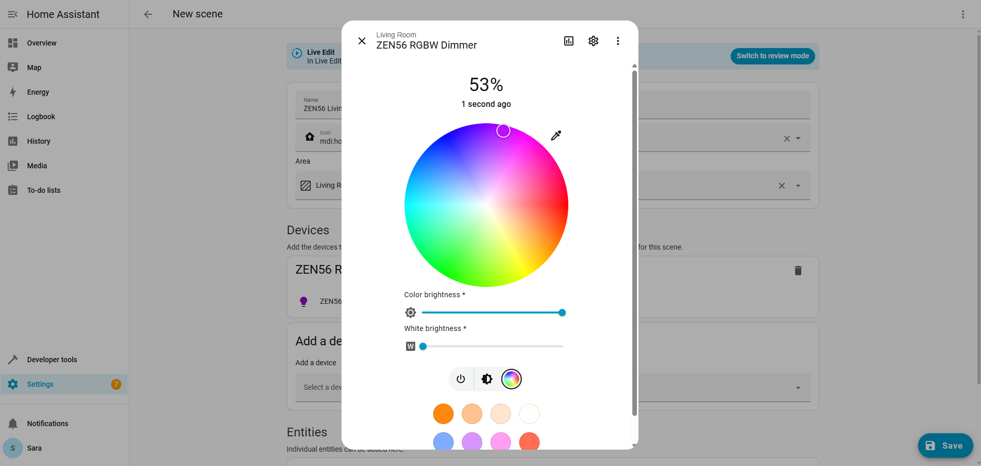Repeat this process for each color you want. You'll end up with various scenes, each containing your custom color selection. Each of these scenes will store the exact color and brightness level you have set, so you won't need to recalculate when using the scene in different automations.