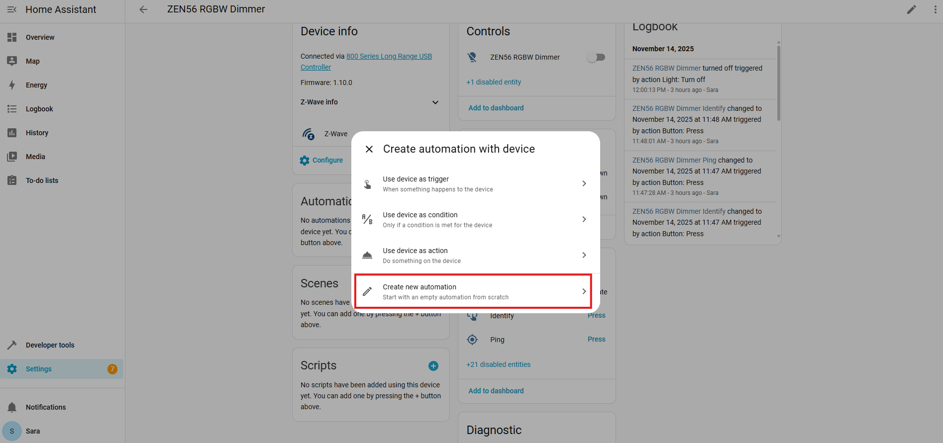 Your ZEN56 RGBW Dimmer can be quickly added to Home Assistant! We recommend using the new JS Z-Wave integration for optimal results