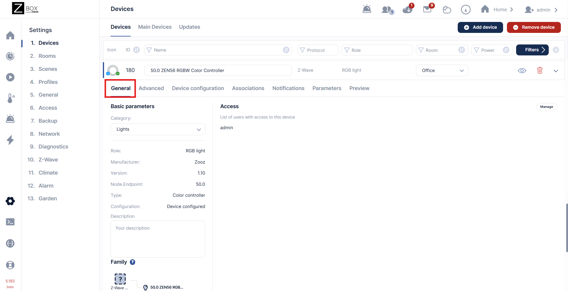 6. You can edit the name, room, icon, etc. for the device. Please note that the Node ID for the device will show a number higher than 255 for ZWLR devices. Nodes 1-255 are reserved for the hub and mesh devices. 256 and higher will be ZWLR nodes in accordance with the Z-Wave Specification.