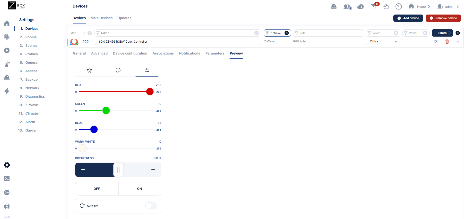 The ZEN56 will display with the main ZEN56 RGBW Color Controller Device, to be used when changing parameters and for device control, and the ZEN56 RGBW Remote Controller, which is used when programming scene control/multi-tap functionality.